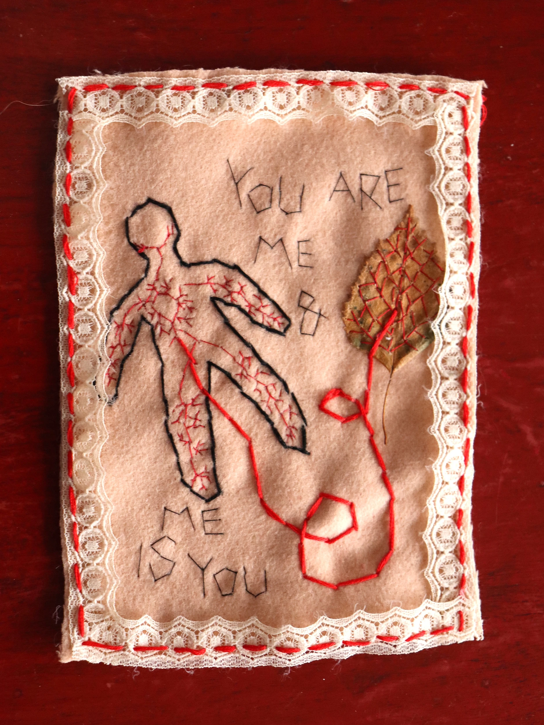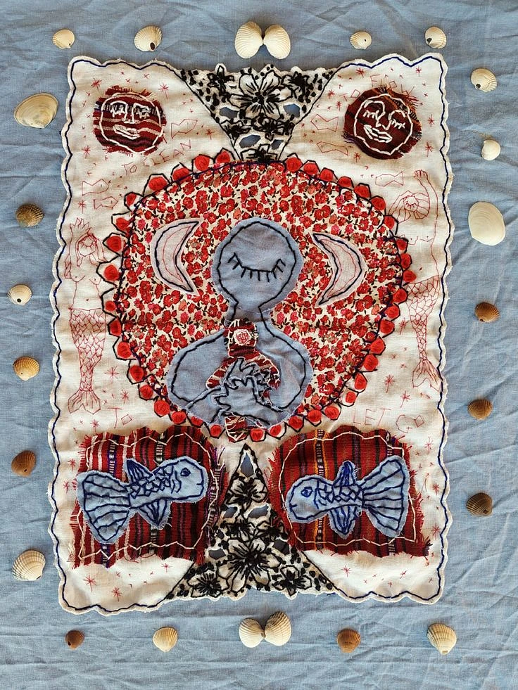 Recycled textiles and embroidery on felt, 50 x 30 cm.