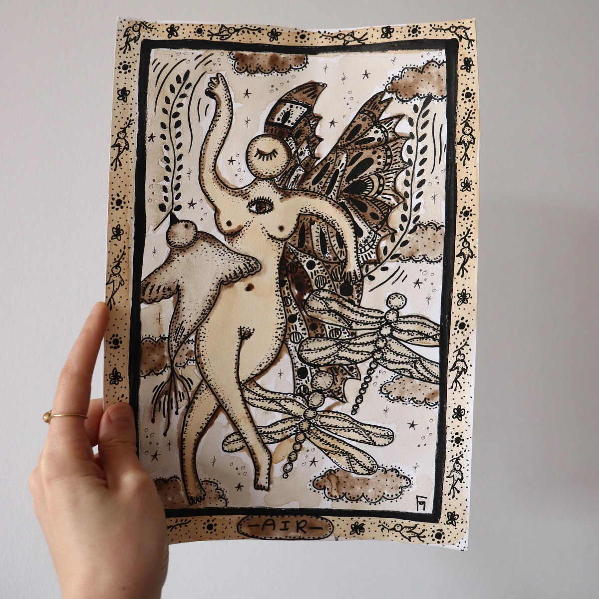 The element Air is visualized by a fairy. It symbolizes playfulness, joy, harmony, communication and ideas. Of course, air was a challenging element to pick pigments from. In the end I decided to go for the things that I could find on the top of trees, that are the closest to the sky and have been touched by the wind. I ended up using autumn leaves, walnuts, rosehip, hazel and holy leaves. Available as a high quality artprint on the sizes A4 and A3, printed on ecofiber paper.