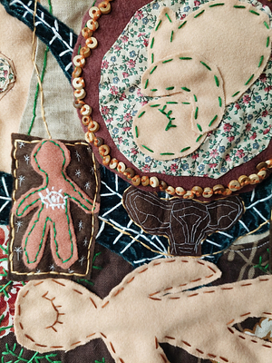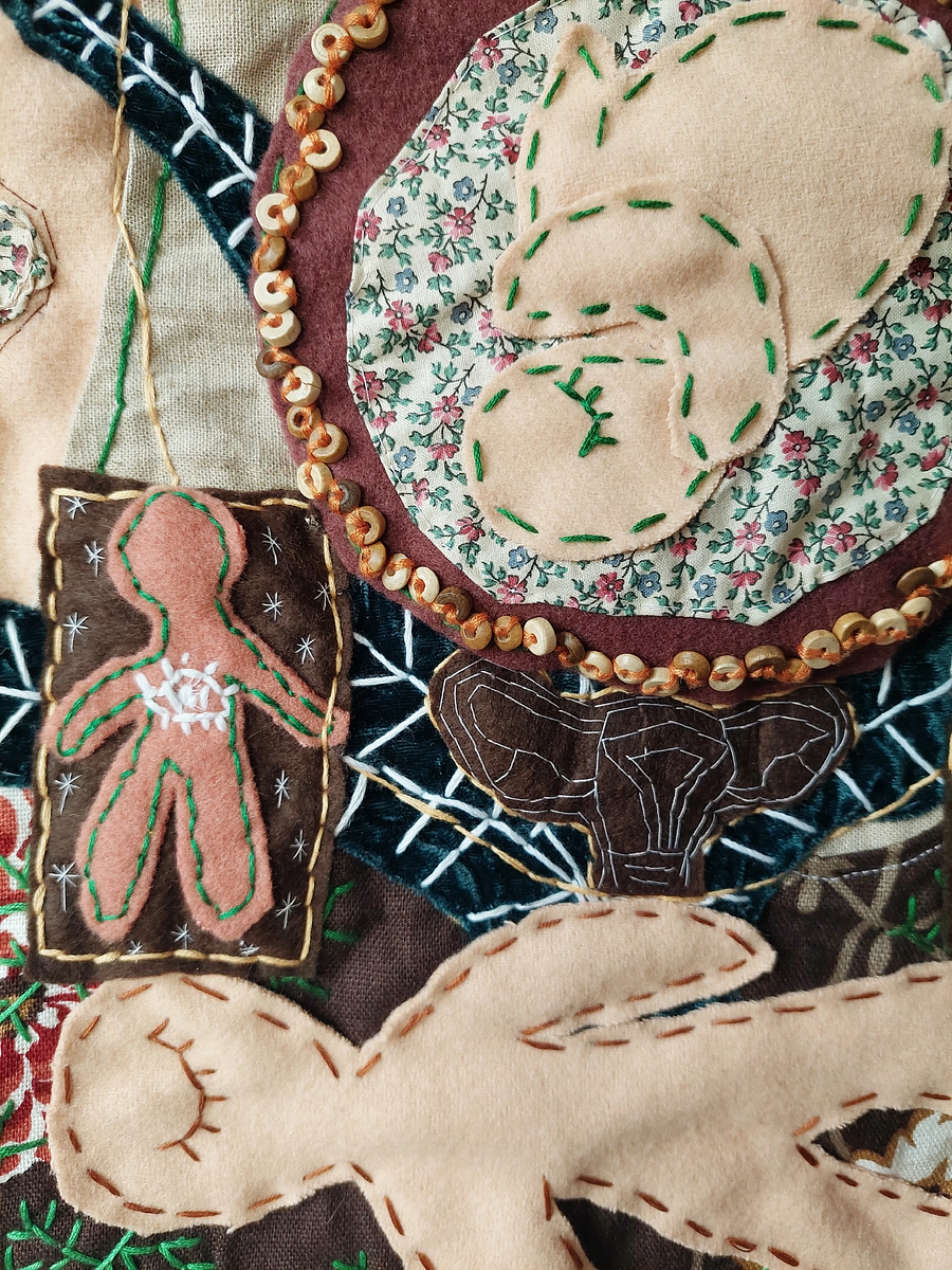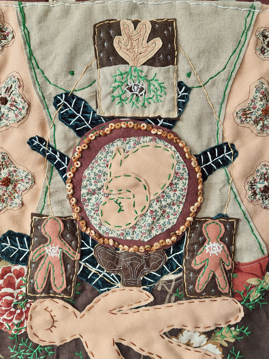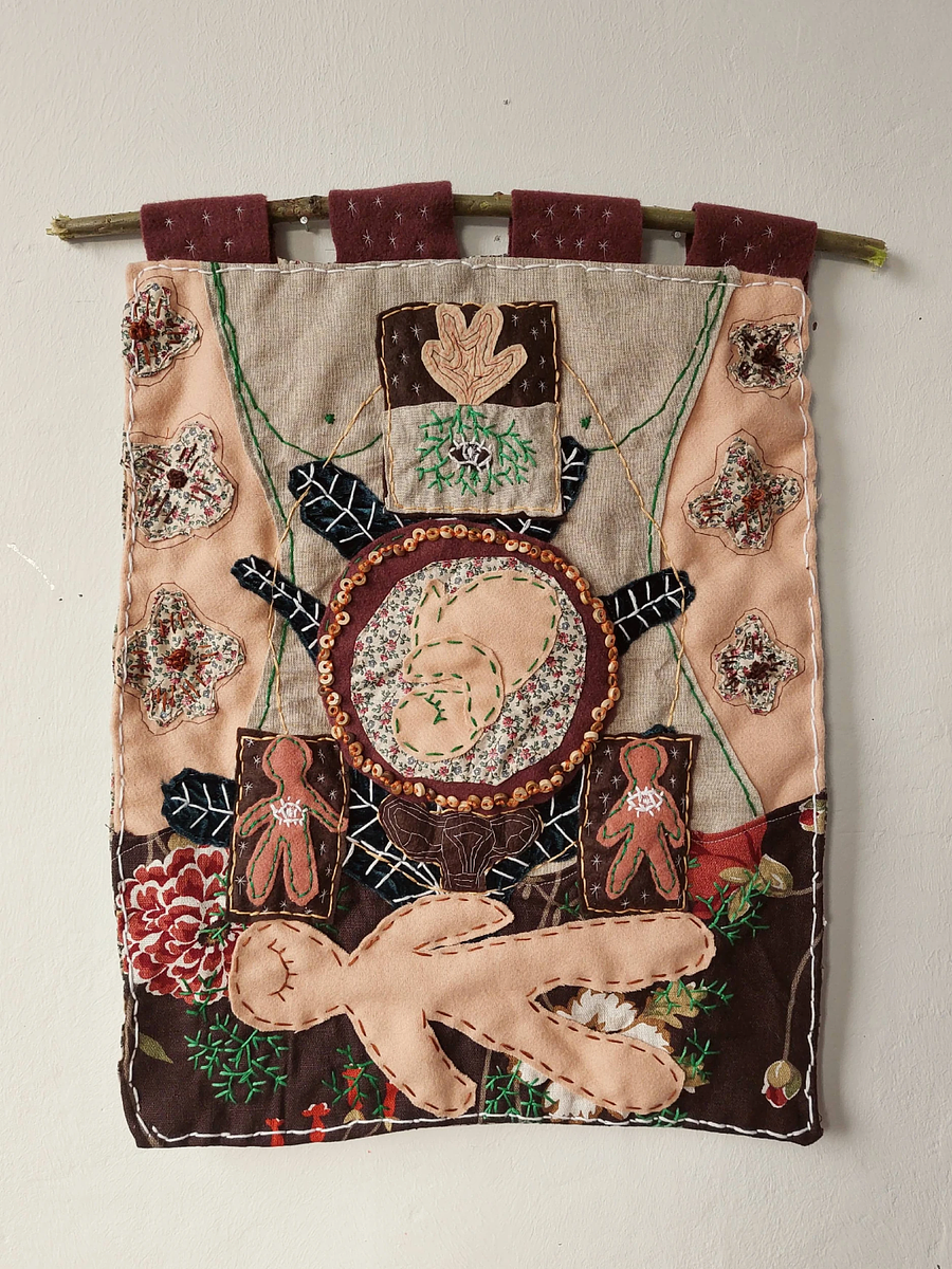 Handembroidery and recycled textiles transformed into a small tapestry 50x40 cm