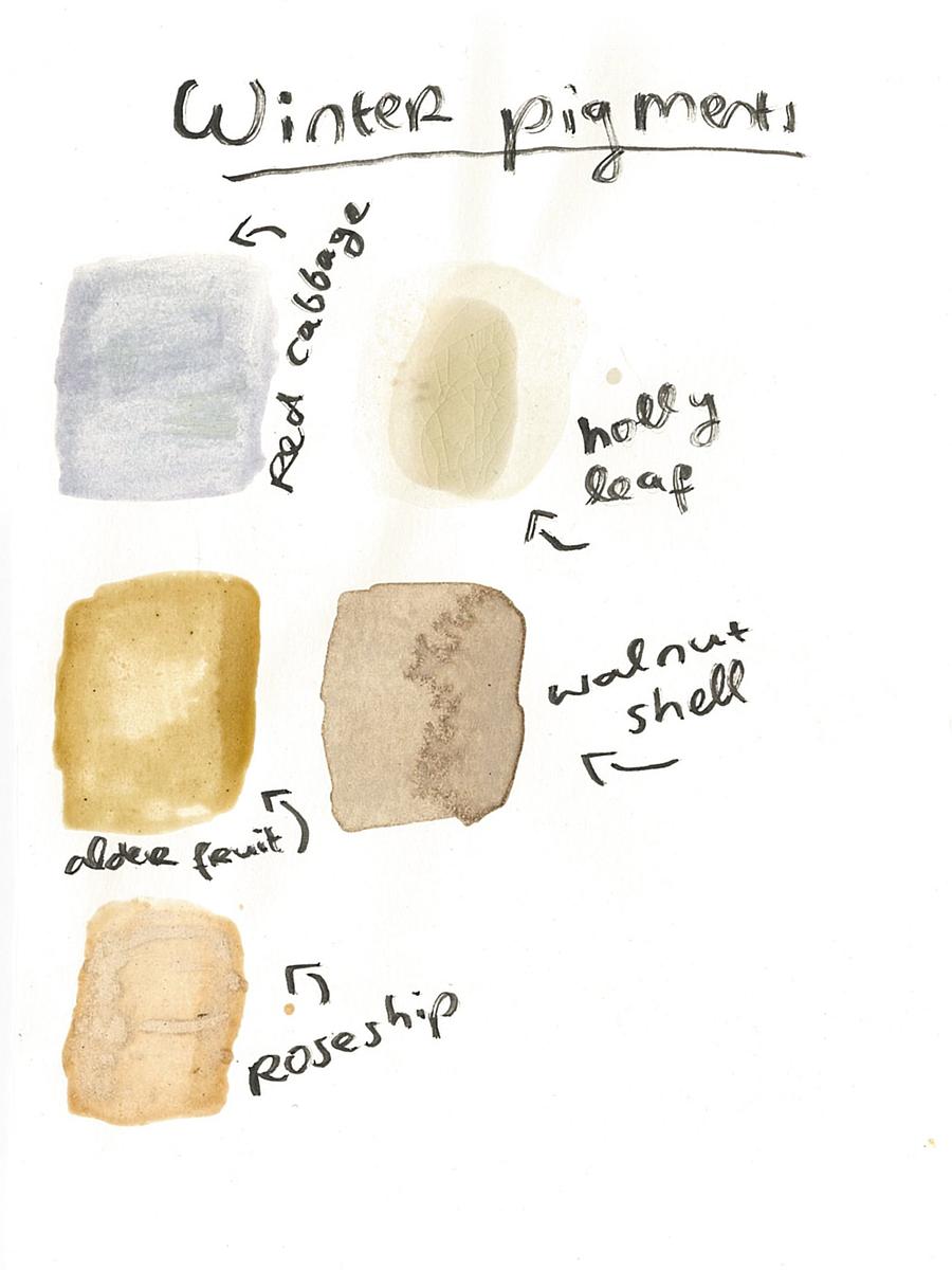 For this illustration, I also used pigments derived from plants commonly found during the winter season: holly leaves, rosehip, red cabbage, walnut shells, and alder fruit.